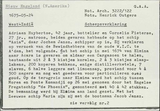 Nieuw Engeland (N.Amerika) G.A.A Not. Arch. 3222/122 Nots. Henrick Outgers 1675-05-24 Scheepsverklaring West-Indië Adriaen Huybertse, 42 jaar, bottelier en Cornelis Pieterse. 27 jr., matroos, beiden gevaren hebbende op het schip " Asia", daar Jochem Jansz. schipper op is, Zij verklaren op verzoek van de Bewindhebbers van de oude W.I.C. te A'dam, het volgende, dat het schip in mei 1674 van Elmina naar Acara is gevaren om aldaar een Cargasoen te halen, bestaande uit 2 â 3 kistjes koralen, 2 à 3 kiftjes slaap lakens, 200 koperen bekkens, enige distilleerketels, 7 slaven, 6 halve leggers met limoensap, proviand voor 4 à 500 negers en nog wat goederen voor particulieren ova. goud. Op de terugreis naar Elmina werd het schip tussen Morea en Ponte Komandji op 26 mei genomen door het Engelse Fregatschip "de Phoenix", gemonteerd met 40 à 42 stukken. De bemanning werd bij Elmina aan land gezet. Met het Zeeuwse schip Maria zijn zij met de bootsman Jacob Jansz. zie vervolg nr.2