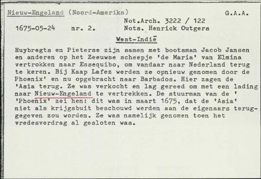 Stadsarchief Amsterdam, archieftoegang 30452, Archief van Simon Hart: (gedeeltelijke) toegang op de notariële archieven, inventarisnummer 358, Regesten van akten in de Amsterdamse notariële archieven en enige andere bronnen. 1578 - ca. 1800, Collectie Hart', 'H' of 'hoofdsysteem'. Regesten geordend op trefwoord. 1578 - 1700, 1711 - ca. 1800, Aardrijkskundige namen, New England - New York de stad