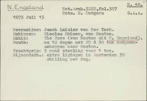 Stadsarchief Amsterdam, archieftoegang 30452, Archief van Simon Hart: (gedeeltelijke) toegang op de notariële archieven, inventarisnummer 358, Regesten van akten in de Amsterdamse notariële archieven en enige andere bronnen. 1578 - ca. 1800, Collectie Hart', 'H' of 'hoofdsysteem'. Regesten geordend op trefwoord. 1578 - 1700, 1711 - ca. 1800, Aardrijkskundige namen, New England - New York de stad