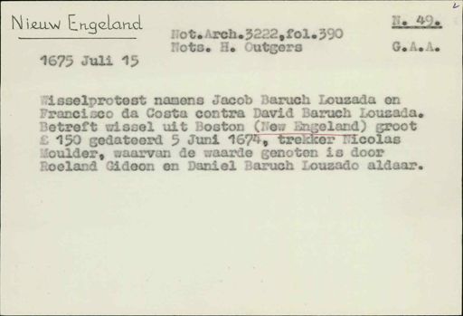 Stadsarchief Amsterdam, archieftoegang 30452, Archief van Simon Hart: (gedeeltelijke) toegang op de notariële archieven, inventarisnummer 358, Regesten van akten in de Amsterdamse notariële archieven en enige andere bronnen. 1578 - ca. 1800, Collectie Hart', 'H' of 'hoofdsysteem'. Regesten geordend op trefwoord. 1578 - 1700, 1711 - ca. 1800, Aardrijkskundige namen, New England - New York de stad