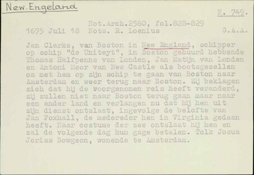 Stadsarchief Amsterdam, archieftoegang 30452, Archief van Simon Hart: (gedeeltelijke) toegang op de notariële archieven, inventarisnummer 358, Regesten van akten in de Amsterdamse notariële archieven en enige andere bronnen. 1578 - ca. 1800, Collectie Hart', 'H' of 'hoofdsysteem'. Regesten geordend op trefwoord. 1578 - 1700, 1711 - ca. 1800, Aardrijkskundige namen, New England - New York de stad