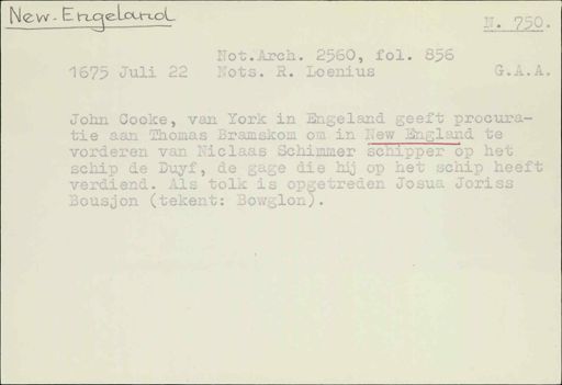 Stadsarchief Amsterdam, archieftoegang 30452, Archief van Simon Hart: (gedeeltelijke) toegang op de notariële archieven, inventarisnummer 358, Regesten van akten in de Amsterdamse notariële archieven en enige andere bronnen. 1578 - ca. 1800, Collectie Hart', 'H' of 'hoofdsysteem'. Regesten geordend op trefwoord. 1578 - 1700, 1711 - ca. 1800, Aardrijkskundige namen, New England - New York de stad
