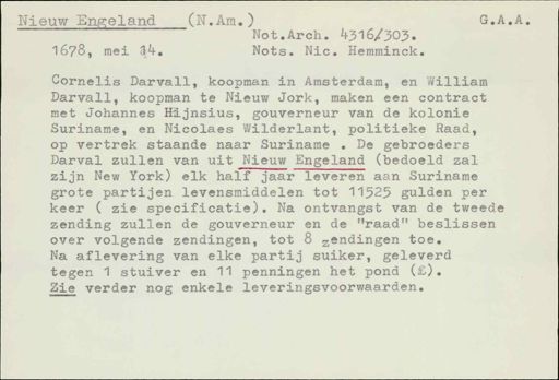 G.A.A Nieuw Engeland (N.Am.) Not.Arch. 4316/303. 1678, mei 14. Nots. Nic. Hemminck. Cornelis Darvall, koopman in Amsterdam, en William Darvall, koopman te Nieuw Jork, maken een contract met Johannes Hijnsius, gouverneur van de kolonie Suriname, en Nicolaes Wilderlant, politieke Raad, op vertrek staande naar Suriname. De gebroeders Darval zullen van uit Nieuw Engeland (bedoeld zal zijn New Yorck) elk half jaar leveren aan Suriname grote partijen levensmiddelen tot 11525 gulden per keer ( zie specificatie). Na ontvangst van de tweede zending zullen de gouverneur en de "raad" beslissen over volgende zendingen, tot 8 zendinge toe. Na aflevering van elke partij suiker, geleverd tegen 1 stuiver en 11 penningen het pond (E). Zie verder nog enkele leveringsvoorwaarden.