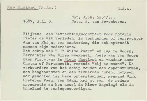 Stadsarchief Amsterdam, archieftoegang 30452, Archief van Simon Hart: (gedeeltelijke) toegang op de notariële archieven, inventarisnummer 358, Regesten van akten in de Amsterdamse notariële archieven en enige andere bronnen. 1578 - ca. 1800, Collectie Hart', 'H' of 'hoofdsysteem'. Regesten geordend op trefwoord. 1578 - 1700, 1711 - ca. 1800, Aardrijkskundige namen, New England - New York de stad