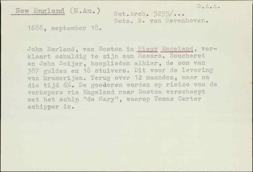 Stadsarchief Amsterdam, archieftoegang 30452, Archief van Simon Hart: (gedeeltelijke) toegang op de notariële archieven, inventarisnummer 358, Regesten van akten in de Amsterdamse notariële archieven en enige andere bronnen. 1578 - ca. 1800, Collectie Hart', 'H' of 'hoofdsysteem'. Regesten geordend op trefwoord. 1578 - 1700, 1711 - ca. 1800, Aardrijkskundige namen, New England - New York de stad
