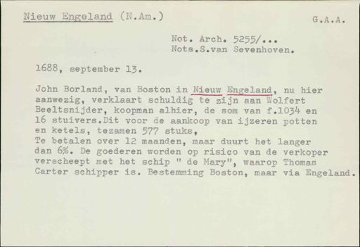 Stadsarchief Amsterdam, archieftoegang 30452, Archief van Simon Hart: (gedeeltelijke) toegang op de notariële archieven, inventarisnummer 358, Regesten van akten in de Amsterdamse notariële archieven en enige andere bronnen. 1578 - ca. 1800, Collectie Hart', 'H' of 'hoofdsysteem'. Regesten geordend op trefwoord. 1578 - 1700, 1711 - ca. 1800, Aardrijkskundige namen, New England - New York de stad