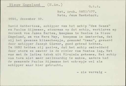 Stadsarchief Amsterdam, archieftoegang 30452, Archief van Simon Hart: (gedeeltelijke) toegang op de notariële archieven, inventarisnummer 358, Regesten van akten in de Amsterdamse notariële archieven en enige andere bronnen. 1578 - ca. 1800, Collectie Hart', 'H' of 'hoofdsysteem'. Regesten geordend op trefwoord. 1578 - 1700, 1711 - ca. 1800, Aardrijkskundige namen, New England - New York de stad