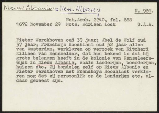Stadsarchief Amsterdam, archieftoegang 30452, Archief van Simon Hart: (gedeeltelijke) toegang op de notariële archieven, inventarisnummer 359, Regesten van akten in de Amsterdamse notariële archieven en enige andere bronnen. 1578 - ca. 1800, Collectie Hart', 'H' of 'hoofdsysteem'. Regesten geordend op trefwoord. 1578 - 1700, 1711 - ca. 1800, Aardrijkskundige namen, New -York/Albany - Nieuw Nederland