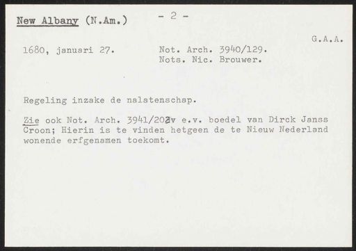 Stadsarchief Amsterdam, archieftoegang 30452, Archief van Simon Hart: (gedeeltelijke) toegang op de notariële archieven, inventarisnummer 359, Regesten van akten in de Amsterdamse notariële archieven en enige andere bronnen. 1578 - ca. 1800, Collectie Hart', 'H' of 'hoofdsysteem'. Regesten geordend op trefwoord. 1578 - 1700, 1711 - ca. 1800, Aardrijkskundige namen, New -York/Albany - Nieuw Nederland