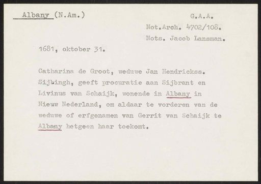 Stadsarchief Amsterdam, archieftoegang 30452, Archief van Simon Hart: (gedeeltelijke) toegang op de notariële archieven, inventarisnummer 359, Regesten van akten in de Amsterdamse notariële archieven en enige andere bronnen. 1578 - ca. 1800, Collectie Hart', 'H' of 'hoofdsysteem'. Regesten geordend op trefwoord. 1578 - 1700, 1711 - ca. 1800, Aardrijkskundige namen, New -York/Albany - Nieuw Nederland