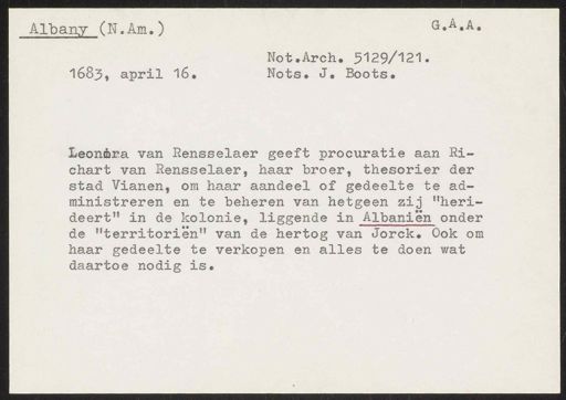Stadsarchief Amsterdam, archieftoegang 30452, Archief van Simon Hart: (gedeeltelijke) toegang op de notariële archieven, inventarisnummer 359, Regesten van akten in de Amsterdamse notariële archieven en enige andere bronnen. 1578 - ca. 1800, Collectie Hart', 'H' of 'hoofdsysteem'. Regesten geordend op trefwoord. 1578 - 1700, 1711 - ca. 1800, Aardrijkskundige namen, New -York/Albany - Nieuw Nederland