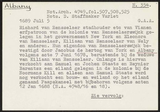 Stadsarchief Amsterdam, archieftoegang 30452, Archief van Simon Hart: (gedeeltelijke) toegang op de notariële archieven, inventarisnummer 359, Regesten van akten in de Amsterdamse notariële archieven en enige andere bronnen. 1578 - ca. 1800, Collectie Hart', 'H' of 'hoofdsysteem'. Regesten geordend op trefwoord. 1578 - 1700, 1711 - ca. 1800, Aardrijkskundige namen, New -York/Albany - Nieuw Nederland