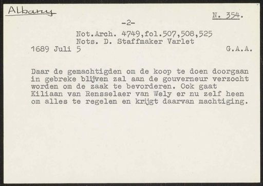 Stadsarchief Amsterdam, archieftoegang 30452, Archief van Simon Hart: (gedeeltelijke) toegang op de notariële archieven, inventarisnummer 359, Regesten van akten in de Amsterdamse notariële archieven en enige andere bronnen. 1578 - ca. 1800, Collectie Hart', 'H' of 'hoofdsysteem'. Regesten geordend op trefwoord. 1578 - 1700, 1711 - ca. 1800, Aardrijkskundige namen, New -York/Albany - Nieuw Nederland