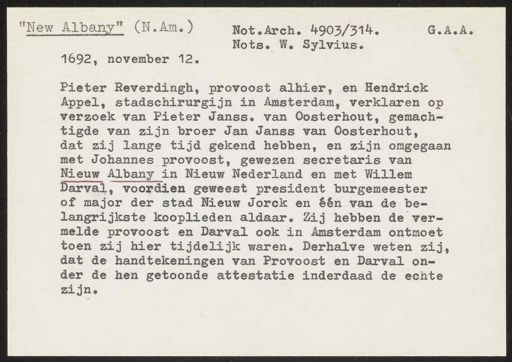 Stadsarchief Amsterdam, archieftoegang 30452, Archief van Simon Hart: (gedeeltelijke) toegang op de notariële archieven, inventarisnummer 359, Regesten van akten in de Amsterdamse notariële archieven en enige andere bronnen. 1578 - ca. 1800, Collectie Hart', 'H' of 'hoofdsysteem'. Regesten geordend op trefwoord. 1578 - 1700, 1711 - ca. 1800, Aardrijkskundige namen, New -York/Albany - Nieuw Nederland
