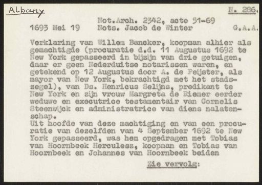 Stadsarchief Amsterdam, archieftoegang 30452, Archief van Simon Hart: (gedeeltelijke) toegang op de notariële archieven, inventarisnummer 359, Regesten van akten in de Amsterdamse notariële archieven en enige andere bronnen. 1578 - ca. 1800, Collectie Hart', 'H' of 'hoofdsysteem'. Regesten geordend op trefwoord. 1578 - 1700, 1711 - ca. 1800, Aardrijkskundige namen, New -York/Albany - Nieuw Nederland