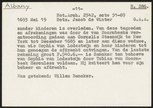 Stadsarchief Amsterdam, archieftoegang 30452, Archief van Simon Hart: (gedeeltelijke) toegang op de notariële archieven, inventarisnummer 359, Regesten van akten in de Amsterdamse notariële archieven en enige andere bronnen. 1578 - ca. 1800, Collectie Hart', 'H' of 'hoofdsysteem'. Regesten geordend op trefwoord. 1578 - 1700, 1711 - ca. 1800, Aardrijkskundige namen, New -York/Albany - Nieuw Nederland