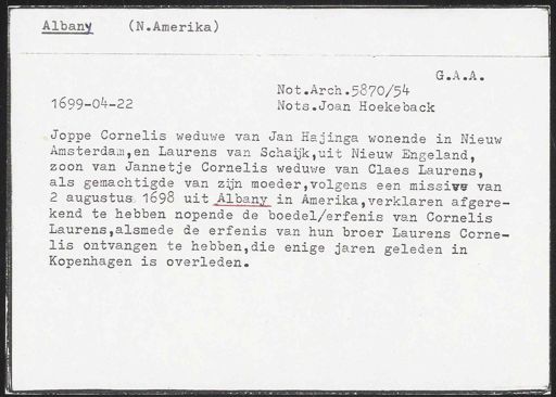 Stadsarchief Amsterdam, archieftoegang 30452, Archief van Simon Hart: (gedeeltelijke) toegang op de notariële archieven, inventarisnummer 359, Regesten van akten in de Amsterdamse notariële archieven en enige andere bronnen. 1578 - ca. 1800, Collectie Hart', 'H' of 'hoofdsysteem'. Regesten geordend op trefwoord. 1578 - 1700, 1711 - ca. 1800, Aardrijkskundige namen, New -York/Albany - Nieuw Nederland