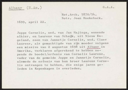 Stadsarchief Amsterdam, archieftoegang 30452, Archief van Simon Hart: (gedeeltelijke) toegang op de notariële archieven, inventarisnummer 359, Regesten van akten in de Amsterdamse notariële archieven en enige andere bronnen. 1578 - ca. 1800, Collectie Hart', 'H' of 'hoofdsysteem'. Regesten geordend op trefwoord. 1578 - 1700, 1711 - ca. 1800, Aardrijkskundige namen, New -York/Albany - Nieuw Nederland
