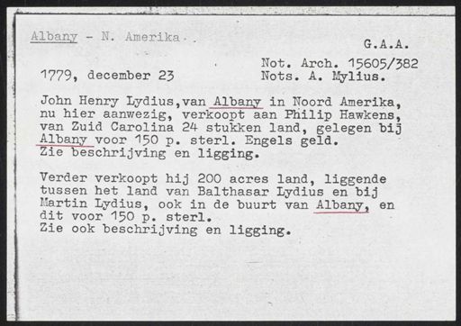 Stadsarchief Amsterdam, archieftoegang 30452, Archief van Simon Hart: (gedeeltelijke) toegang op de notariële archieven, inventarisnummer 359, Regesten van akten in de Amsterdamse notariële archieven en enige andere bronnen. 1578 - ca. 1800, Collectie Hart', 'H' of 'hoofdsysteem'. Regesten geordend op trefwoord. 1578 - 1700, 1711 - ca. 1800, Aardrijkskundige namen, New -York/Albany - Nieuw Nederland