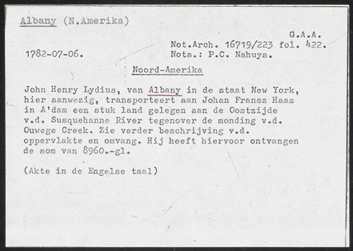 Stadsarchief Amsterdam, archieftoegang 30452, Archief van Simon Hart: (gedeeltelijke) toegang op de notariële archieven, inventarisnummer 359, Regesten van akten in de Amsterdamse notariële archieven en enige andere bronnen. 1578 - ca. 1800, Collectie Hart', 'H' of 'hoofdsysteem'. Regesten geordend op trefwoord. 1578 - 1700, 1711 - ca. 1800, Aardrijkskundige namen, New -York/Albany - Nieuw Nederland