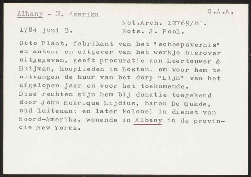 Stadsarchief Amsterdam, archieftoegang 30452, Archief van Simon Hart: (gedeeltelijke) toegang op de notariële archieven, inventarisnummer 359, Regesten van akten in de Amsterdamse notariële archieven en enige andere bronnen. 1578 - ca. 1800, Collectie Hart', 'H' of 'hoofdsysteem'. Regesten geordend op trefwoord. 1578 - 1700, 1711 - ca. 1800, Aardrijkskundige namen, New -York/Albany - Nieuw Nederland