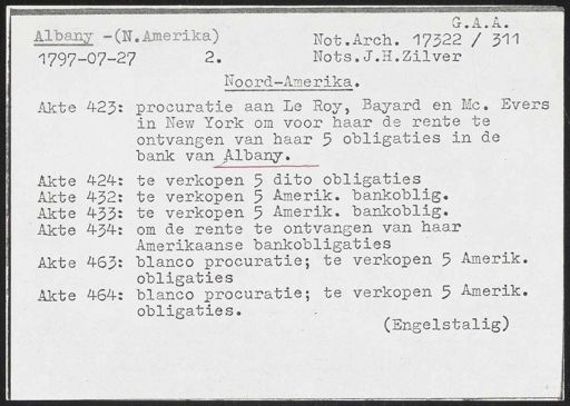 Stadsarchief Amsterdam, archieftoegang 30452, Archief van Simon Hart: (gedeeltelijke) toegang op de notariële archieven, inventarisnummer 359, Regesten van akten in de Amsterdamse notariële archieven en enige andere bronnen. 1578 - ca. 1800, Collectie Hart', 'H' of 'hoofdsysteem'. Regesten geordend op trefwoord. 1578 - 1700, 1711 - ca. 1800, Aardrijkskundige namen, New -York/Albany - Nieuw Nederland
