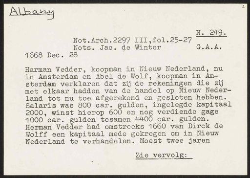 Stadsarchief Amsterdam, archieftoegang 30452, Archief van Simon Hart: (gedeeltelijke) toegang op de notariële archieven, inventarisnummer 359, Regesten van akten in de Amsterdamse notariële archieven en enige andere bronnen. 1578 - ca. 1800, Collectie Hart', 'H' of 'hoofdsysteem'. Regesten geordend op trefwoord. 1578 - 1700, 1711 - ca. 1800, Aardrijkskundige namen, New -York/Albany - Nieuw Nederland