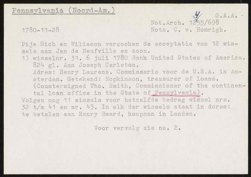 1) wisselnr. 31. 6 juli 1780 Bank United States of America.