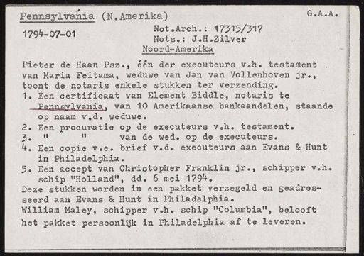 G.A.A Pennsylvania (N. Amerika) Not.Arch.: 17315/317 1794-07-01 Nots.: J.H.Zilver Noord-Amerika Pieter de Haan Psz., één der executeurs v.h. testament van Maria Feitama, weduwe van Jan van Vollenhoven jr., toont de notaris enkele stukken ter verzending. 1. Een certificaat van Clement Biddle, notaris te Pennsylvania, van 10 Amerikaanse bankaandelen, staande op naam v.d. weduwe. Een procuratie op de executeurs v.h. testament. 2. 3. van de wed. op de executeurs. Een copie v.e. brief v.d. executeurs aan Evans & Hunt in Philipsphia. 5. Een accept van Christopher Franken jr., schipper v.h. schip "Holland", dd. 6 mei 1794. Deze stukken worden in een pakket verzegeld en geadresseerd aan Evans & Hunt in Philadelphia. William Maley, schipper v.h. schip "Columbia", belooft het pakket persoonlijk in Philipsphia af te leveren.