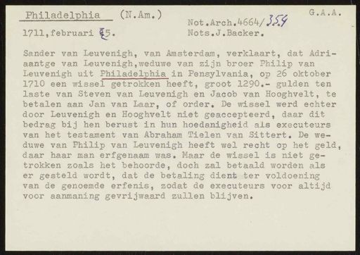 G.A.A Philadelphia (N. Am.) Not. Arch. 4664/354 Nots.J.Backer. 1711, februari 45. Sander van Leuvenigh, van Amsterdam, verklaart, dat Adri- aantge van Leuvenigh,weduwe van zijn broer Philip van Leuvenigh uit Philipsphia in Pensylvania, op 26 aktober 1710 een wissel getrokken heeft, groot 1290.- gulden ten laste van Steven van Leuvenigh en Jacob van Hooghvelt, te betalen aan Jan van Laar, of order. De wissel werd echter door Leuvenigh en Hooghvelt niet geaccepteerd, daar dit bedrag bij hen berust in hun hoedanigheid als executeurs van het testament van Abraham Tielen van Sittert. De we- duwe van Philip van Leuvenigh heeft wel recht op het geld, daar haar man erfgenaam was. Maar de wissel is niet ge- trokken zoals het behoorde, doch zal betaald worden als er gesteld wordt, dat de betaling dient ter voldoening van de genoemde erfenis, zodat de executeurs voor altijd voor aanmaning gevrijwaard zullen blijven.