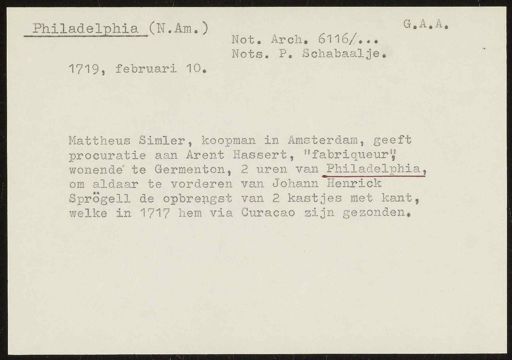 Stadsarchief Amsterdam, archieftoegang 30452, Archief van Simon Hart: (gedeeltelijke) toegang op de notariële archieven, inventarisnummer 360, Regesten van akten in de Amsterdamse notariële archieven en enige andere bronnen. 1578 - ca. 1800, Collectie Hart', 'H' of 'hoofdsysteem'. Regesten geordend op trefwoord. 1578 - 1700, 1711 - ca. 1800, Aardrijkskundige namen, Pennsylvania - Yorkriver