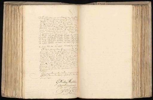 Sesobligatien uit de Loterije van ses Mellen nen guldens, gearresteert den 27 Februrr Ao. 1751 ten lasten van Holland in Westvrieslen ten comptoire deser stad Amsteldam, staa de alle op de naamen van de Voogden over Geraad Nicolaasz Hasselaer wegens den Boedel van den Heer Daniel Rick, ieder groot tien hondert ponden of guldens Can¬ taal, gedateert den eersten Maart No. 17 en geaggreedt den 3 Januarij Ao. 1752 # S de Eerste Fol: 99 F. No: 1181 No. 1181 Reg. fol 1 11 de twede Kal: 99 Vo. No. 1182, No. 1182, Reg 15811 de derde Fol 99 V. No. 1183, No. 1183, Reg: fol1 de vierde Fol 99 Fo. No 1184, No. 1184 Regta. J de vijfde Fol:1oo, No. 1185, No. 1185: Reg. fol de sesde Fol: 100, No. 1186, No. 1186 Regta. fol En bekende de Heer Comparant de Koo penningen voor de opgemelde ses obligatien uitgeloovt, soo wegens Capitaal als daar op verscheenen en te goede sijnde Interesten van de Kopers te hebben ontvangen, quite¬ gende de Heer Comparant de Kopers des wegens en beloovde de Heer Comparant deselve ses obligatien ten allen tijde voor alle op en aanspraak te sullen quarante een en de Kopers of hun recht verkrijgens desaangaande van Kost en schadeloos wn demneeren, onder verband van des Heer Comparants persoon en goederen als naar Rechten. Gepasseert binnen Amsteldam in praesentie Gedaad de Roo van der Horst en fredrik van der Huijs als getuijgen E Nielenm Aaselan Goovanderhorst M: H:V: Hees H:V: Heel Notaris.