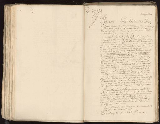 No. 374. Aprgendor Op den Twaalfden Junij des Jaars seeventien hondert seeventig compareerden voor mij Hermanus van Heel Notaris te Amsteldam bij den Hove van Holland geadmitteert de Heer Pieter Pijl Nicolaasz als in huwelijk hebbende Jufvrouw Catharina Bommer en deselve Jufvrouw Catharina Brommer ten deesen met haar voornoemde man geadsisteert en door hem tot het pasteere deeses geouthoriteer en gequalificeert, woonende de Comparanten binnen dese stad, mij Notaris bekend, zijnad Comparante Jufrouw Catharina Bommer Edochter van Trijntije vlieger huis ndien van sijs Brommeres heip 1 eers ^ meede ervgenaame van haar groot moeder Trijntje Del weduwe Pieter vlieger en bij deelenij op den 29 April 1760 ter weeskamer der stad Edam gedaan, onder anderen het recht en de eegendom bekoomen hebbende tot de naatemeldene twee obligatien, die zij Comparante naa ^ int bjlyd haar meerderjarigheijd heeft ontvangen van haare geweesene voogden de Heern huijs noiumer, Hermanus Dobber en Jacob Stoen en aan haar zijn afgeseven ter weeskamer der stad Edam, en wel op den 3e Augustus des Jaars 1763 blijkende bij Extract uit het Register van de weeskamer der stad Edam door de Heer seereta Us H: Boot op den 12 Augustus 1763 getekent, 6 En verklaarden de Comparanten verkocht te hebben ende bij deesen te transpoiteeren, cederen ende in vollen vegen eegendom over te geeven aan en ten behoeven van de weEde gestiengen Heer Mr. Abee van der Willige Bailluw van Vlieland, mitsgaders secretaris der stad Enckhuijsen etc. Twee obligatien ten lasten van westvriesland een hiet Noorderquaities, als Een ten comptoire der stad Alkmaar¬