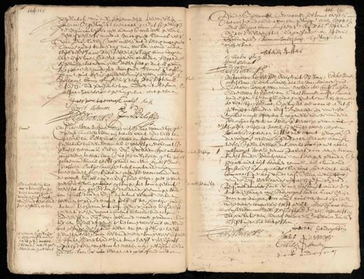 stib deses Jaars xviC sessenvijftigh binnen koppen hagen is gestorven ende deser werelt overleden seggende sij getuijgen tot redenen vande Weterschap dat sij geburen sijn geweest vande voors. Margriet Thomas ende oversulx vant guit verszis boedekennis te hebben Aldus 5 vverklaart binnen Amstelie. desen xxii septemb. @1656. Ter presentie van Gerret erdsia, ende Cljar Barentsz all getuijgn he aengestaan, Jaerperbaeren Canclisz Noch Gerrit Bosman AN. J:de Winter N.P. gen a xr losfs Compijac Steven Jasparsz Alager out 36 Jaren woonachtigh opte Zedijk binnen deser stede, mij notario bekent. Ende heeft ten versoecke van Pieter laartsz schipper van Worhum, onder presentatie van desen Solemmelik te bebestigen ^ verklaart, ende getuijcht hoe waar is, Dat den reqt. op den derden April ao 1668 jongstleden ten overstaan ende int bij wesen bij hem getuijgen als goedeman) fmalck heeft gekocht van eenen Cornelis Jansz Zijloff, een Partije Caribische tabak monterende ruijm twee hondert gul., Onder die oppresse voorwaarde dat de voorsz. Etoff aan den xq. soude levernen goet gesont goet, ende in betalinge londe ontfangen tien tonnen gesoute vlees tot tien gul. d'ton ende dresterende penningen soude hem Lijloff door den reve. in Contant betaalt werden welcken volgende d' voorsz. Polijloff den partge aribise taback ten overstaan van hem getuijge aanden req reeft gelevert die hem voort incontant betaalde hondert gul. Ende heeft den he daar op binnen d' voorsz. geordonneerde tijd hem vijloff de gemelte tien tonnen vlees uijt vriesland Eg oft over gesonden die rijende kelder van hem getuijge heeft gebracht ende heeft aldaar ses van de selve sonnen vlees verpekelt ende versouten, ende d'resterende vier tonnen heeft d' voorz. Lijloff naddat hij d'selve ongepaar tien weecken in sijn getuijgens kelder had laten staan ende al laten bederven eerst op vriesland wederom ƒ 1 # int voorsz. lchip #wel te weten 1 H15 116 sonde ende getraack ende d' voorsz. ses tonnen heeft hij Dtot noch ve inde kelder van hem getuijge laten leggen Aldus verklaart binnen Amstelre. desen xxiie septemb. @o xviC. sessenvijftich. Ter presentie van Ggerrit Bosi Harman Jansz Hop als getuijgen hier overgestaa Steven Jasters S Jansen Hors GGerrit Bolmans A Jd Winter N.P. Cupareerden Ec Wessel Hendrixsz out 38 Jaren Eecke Jansz out 41 Jaren, ende Dick Andriesz out 32 Jaren, siouwers vande EHeeren Bewinth ebberen vande OostIndische Comp alsier Ende hebben ten versoecke van Claas Samonsz mede siouwer vande gemelte Compe. onder presentatie van desen folemmelia te bevestigen verklaart, ende getuijcht hoe waar is Dat sij getuijgen neffensden reqte. op den eersten van deser lopende maants september in opgemelte dienst van desern stede sijn afgeviaen na Ivlie ende vervolgen gekomen int tschip den oiphant twelck sij getuijgen hebben helpen stouwen ende opbrengen uijttet drie voort Dampos, ende dien volgens verklaren sij getuijgen hen deerwel bewist te sijn, ende gesien te hebben, dat seecker sackje met nooten muscaat twelck vermist wiert door eenen Juriaan knecht vande Bewinthebber van Leeuwen gevonden ende gehaalt wiert uijt seecker rommelkoij, staande inde konstabels kamer aande stienboort op de hecht-balck endei naast de koi vanden reqe. ende sulcx met uijdpdekaij van den 2eq. Verklarende wijders sij getuijgen dat de Req. met dencker vermis er noch bostruijt in de voorssz. komstabelskamer was, ende dien volgens sonder kaars ende licht daar most ingaan, door abuijt en mis verstant sijn hoet ende voorsz. rommelkoij heeft geleijt Aldus verklaart binnen Amstelredamme desen xxiien septemb. @o xviC. sessenvijftigh Ter presentie van Siewert Douwesz ende Reijnier Jariksz als getuijgen hier overgestaan westel hendrijckten J:de Winter N.P. Tmerck Coestelbbi Selcke ansop erff anderijon,