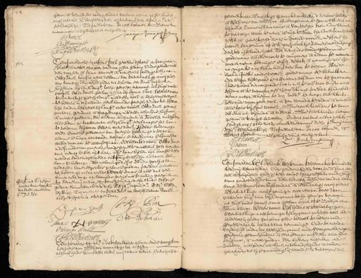 2 gt gerg, int S. regene vande transporten der stadt Amsterdam fo. 70 verso gedaan ende verricht sal werden / ondert verbant als na reste sonder argh ofte list In Amstelre. desen achtentwintichsten April ao. xviC sessenvijftigh Ter presentie van Jacob Hamel ende Gerrit manricque als getuijgen hier overgestaen Jncop Joopsz schoor J:. Mamel G Manricque J:de Winter N.P. Compareerdoele Mattheus Oost gewesene notaris en pronireute in Brasil, ende metter overgaan van daar alhier gekomen Ende geluede mits desen voorhem ende sijnen erven wel ende deuchdelik schuldigh te sijn aan Ottho Jansz kuijper, alhier de somme van vierentachtigh caroli gul. van twintigh stuijvers d'gulden ter sake van een Jaar verschenen huijshuur bij hem Compte. tot sijn genoegen verwoont int huijs vande voorsz. Ottho Jansz gestaan alhier op bomen sloot Welcke voorsz. vierentachtigh gul. lij Compt. mits desen kost ende schadeloos belooft te betalen in drij maanden eerstkomende preijs, Ende tot versekert heijt vandien, soo heeft hij Compe. aande voorsz. Ottho Jansz getransporteert geredeert ende overgedragen mits desen alle sijne huijsraat ende meuble goederen, Item klederen, kleijnodien ende Juwelen mitsgaderen alle sodanige tractementen als hij Comp. eerstdaaghs sal komen te verdien en 'tsijwaar Ofte in wiens dienst 'tselve soude mogen wesen. Omme bij gebreecke van precijse betalinge d'selve te alomme te mogen aanvaarden, verkopen ende beneficieren ende sijn achter wesen daar aan te consequeren. Des belooft d'voorn. Ottho Jansz in desen mede comparerende aande gemelte mattheus post tnanspor tant weders te sullen uijtkeeren alle 'tgene bij hem uijt krachte deses meerder soude mogen werden onttangen als sijn achterwesen sal komen te bedragen, Tot nakominge deses verbinden parten en ten wederlijden hare respective persone ende goederen present ende tbekomen tot bedwangh als na rechte, Voorts vermane ik nots. dat dese binnen acht dagen eerstkomende prerijs moste werden geregistreert ter secretaris alhier, conform de keure deser stede. Aldus gedaan binnen Amstelre. desen xxixe. april ao. xviC. sessen vijftigh. Ter presentie van Pieter Jansz van Swol, ende Outman Jansz als getuijgen hier overgestaan A: Sort Jansen van Roen Op Jansen Tmerck gebtelt bij butman Jansz J:de Winter N.P. Compareerde &c mr. Dirck van Staden als man ende vooght van Levijntje van Ghoorwoonachtigh tot alphen althans sijnde binnen deser stede, mij notario bekent, Ende heeft d gt 2 geronstitueert ende nachtigh gemaakt mit desen d'Eerbare Neltje ende Weijntje van Ghoor sijne Swagerinnen, te samen, off elck int bij souder, Omme uijtden name ende van wegen hem Constituant te vervolgen, waar te nemen, ende uijt te voeren sijn Constituants sake recht ende gerechticheijt die hij in qualite voorsz. neffens sijn voorsz. swagerinnen op ende tegens Aachtje Felmers meerderjarig dochter uijtstaande heeft Tot dieneijnde voorde geordonneerde goedemannen als ellewaarts te companeren ende aldaar te nemen doen en nemen sodanighe eijsch, debath ende conclisie als sijl. na exigentie van Laken sullen verstaan te behoren Item de saak in questie aande voorsz. goede mannen te sijbmitteren Der selver luiijtsprake te approberen off daar van te provoceren Ende vorder dien aangaande soo in rechte als daar buijten alles te doen ende te verrichten, wes hijCorstituant present sijnde soude kennen mogen, ende behoren te doen mede te mogen substitutien Belovende voor goet, vast, ende van waarden tehouden ende doenhoude alle 'tgene bij sijne voorsz. Geconstitueerdens te samen off elck int bijsonder ende desselfs Gesubstitueerden hierinne gedaan ende verricht sal werden Ondert verdant als na rechte sonder argh ofte listzn Amstelredamme desen i. maij anns xviC sessenvijftigh. Ter presentie van Jacob kapel, ende Gerrit Bosman als getuijgen hier overgestaan M Dirck vanstader J. Hlame G: Botman J: de Winter N.P. Compareerde Ec. Hendrik Westerman kleermaker binnen deser stede mij Notario bekent Ende geliede mits desen voorhem ende sijnen erve wel ene Aeugrdelik schuldigh te sijn aan de heeren regenten vande huijsarmen aande oudesijde binnen deser stede, ten behoeve van der selver armen. de somme van Vijffhondert ende sessendertigh caroli guldens seventien stuijv: en achtt penningen over resto van twee Jaren verschenen huijs-huur bij Comparant tot sijn genoegen verwoont int huijs vande voorsz. armen gestaan alhier opte Zeedijk over Bomensteegh, Welcke voorsz. Vijffhondert ende sessendertigh gul. seventien stuijv: en acht penningen hij Comparant mits desen kost ende schadeloos in goeden gangbaren gelde belooft te betalen aande gemelte regenten tot der selver vermaninge. Ende tot meerder Versekertheijt van dien soo heeft hij Comparant aande Voorgemelte regenten gecedeert, getransporteert en overgedragen mits desen allen sijne Huijsraat, ende meuble goederen Item klederen, kleijnodien, ende Juwelen, mitsgaders alle sijne uijtstaande schulden ende vordere gerechticheden die hij jegenwoordigh is hebbende ende vervolgens sal