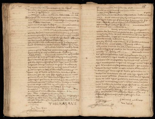 g 106 Compareerde BThomas masman van Lubeck staande op vertrek omme voor adelborst mettet schip Rijnland te gean na Oostjedien in dienst vande Ed: heeren bewinthebberen van Oost alhier Jadische Compende bekende sulx hij doet mits desen voorhem ende sijnen erven, wel, ende deughdelijk schuldighte sijn aan Rebbert hamelton woonachtigh opte Zeedijck binnen deser stede de somme van een hondert ende twintigh caroli gul., van twintigh stuijvers de gulden, ter Jake van verteerde koften ende verschoten penningen, bij hem Comp. tot vorderinsse van fijn aanstaande reijse, te dericke qolen ende ortfangen Welke voorsz een hoidert ende twintigh gul., hij Comp. mitsdesen kost ende schadeloos, be hooft te betalen aande voorn. Robbert hamelton of toonder deses tot der selverver maninge, ende Ende tot verdeeckertheijt van dien, soo heeft hij Comp aande voorsz. Robbers Hamelton ter voorsz. somme toe, getrant porteert ende overgedragen sulx hij doetuur desen sijne eerste, ende gereerte gagie,/ maant, ende buijt¬ gelden bij hem Comp op dere sijne aanstaande reijse, of eenige andere voijagie te verdienen tsij waar natoe ofte in wiers dienst 'tselve soude mogen westes Belovende d'betalinge daar uijste laten geschieden, en 'tselve teer kennen als ost aan sijn eijgen persoon were gedaan, daar toe vrbulende sijn persoen en alle sijne goederen, prerent, ende toekomende onderwerpende d'selve allen rechten ende rechteren honder ergh ofte list in Amcstelredamme desen xxxien martio xvi twee ende sestigh de klocke harf acht 1 mmorgens Tev presentie van Abraham Kuijlman ende Jan van Torn, als getuijgen hier overgestaan #Eade dat boven ende behalven sodanige eenhondert ende vijftigh gul. alshij compe. aande voorsz. hamelton schuldigh na leijt de obligatie ende aantekeningh ten comptoire van Oost Indisere Comp alhier gepasseert J:O.MArall Ahuijsemam Jan van Jorn J:de Winter N.P. gt 100. 107. Compareerde heedrik Piesersz van vliet staande op vertrekomme voor timericac mettet schip Swaterhoct te geeen na Oostindien indienst van Ed: heeren bewinthebberene van Dostfadische Cuijs alhier. Ende bekende sulx hij doet mip desen voor hem ende sijnen erven wel ende deuchdelijk schuldigh te sijn Andries Cornelisz aan Marritje Alnen hlijsvrouw van woonachtigh inde hasselaarsteegh binnen deser stede de somme van Eenhondert caroli gul van twintigh stuijvers de gulden, ter sake van verteerde koften ende verschotenpen nngen, bij hem Cemp. tot vorderisse van fijne aanstaande Teijse te danke genoten ende entfangen Welke voorszeen hondert gul. hij Comp. mits desen koff ende schadelcol belooft te betalen aande voorn. Marnitje Alven off oonder deses tot der selver vermaninge, Ende tot verseeckertheijt vandien soo heeft hij Comp eande voorsz Marritje Amen ter voorsz somme toe getransperteert ende overgedregen siele hij - doet mitsdesen rijne eerste ende gereetste gagie maant ende buijtgelden bij hem Comp. op dese sijne aanstaande reijse ef eenige andere voija gie te verdienen, trij waar na toe ofte in wiens dienst tselve houde mogen weren, Belovende d'betalinge daaruijt te laten geschieden en tselve te erkennen als eff aan sijn eijgen per hoon ware gedaan daar toe verbuedende sijn per soon en alle sijne goederen, present, ende toeko mende onderwerpende d'selve ellen rechten ende rechteren, honder argh ofte list in Ancstel redamme dosen eersten April ao H xxi twee ende sestighsmiddaals de klockehalf twaeef Ten presentie van Abraham kuijlmen, ende Jacob Blijdenberghkleicken mijns notarij getuijgen hier toe versocht, Ahuijlmean henderick pieterse gelijdenberih van vliet J:de Winter N.P.