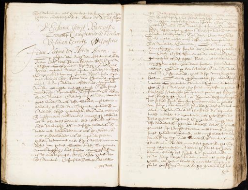 Testateuren als hier toe versochte getuijgen hebben onderteijckent, Anno et die ut supra D'Eersaeme Gerrit Barentsen Tomans Cruijdemer ende d' Eerbare Belitien Eeverts. Dispositie Inden Naeme des Heren Amen. Op huijden den Achsten Novembris, Inden Jaere desselffs ons Heeren Jesu Christi, Duijsent Sesshondert vijftigh, Indictione tertia, omtrent twee uijren naerden Middagh, Compareerde voor mij Jacobo Westfrisio Open¬ bare Notaris bij den Hove van Hollandt geadmit¬ teert, 't Amsterdam residerende, ter prentie