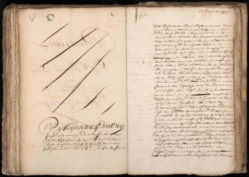 Op Huijden den 14e. decemb. 1693 Compareerde voor mij David Stafmaker Varlet Openbaar Notans bij den houd van hollant geadmitteert 't amsterdam Residerende D' Hr„ Dirck van de pene 166 14e„ December 1691 D' Hr. Dirk van de Perre Luijtenant ter Leeren mij Notario bekend, mede Erfgenaam van d' Hr. Jacob Claasse Saijman zalr. in sijn Eeeven Bewint hebben van de geoctroijeerde Oostindiesche Compagnie ter Comen van Zeeland sijn Hr„ Compts. over groot vader, en de verclaarde te Constitueeren, en magtig te maken D' Hs„ en Mr. Cornelis Massis ontfangen der convoijen, en lixenten tot middelbrirg, sijne schoonbroeder, omme te vorderen, en ontfangen van de Heere Bewint hebberen van de Oostindi¬ - sche Compagnie ter Camere voorsz. sodanige vier hondert Ponden vlaams Capitale Eletie als de Hr„ Compt: nevens de Helgeconsti¬ Jare itueerde, ende d' Hr„ Dirk van de Perre Comonik tot uijtregt, voor hun selven, en als voogden over Juffr. Cornelia Jacob vander Perre, eenige nagelatene dogter van wijlen d' Hr. Mr. Jacob van de Perre¬ in sijn leven Griffier tot Exel, bij Tententie van den Hogen nader van holland uijt den Boedel van wijlen Sr. Pieter van moerbeek sijn geadjudiceert, en toe gewesen quitancie van den ontfange te Passeeren, en voor nameninge te Canderen, authoriseerende d' Hr. Bconstitueerde ook, omme de voorsz. vier hondert Ponden vlaams Olatie te verkopen registreren den Copere te Transporteeren, volgens stijle de Cooppenninge te ontfangen, de schulden die nog te betalen staan, wegens den Boedel van d' Hr. Haijman te voldoen wijders nog omme de gemeene, en nog eder onverdeelde onroerende goederen van den