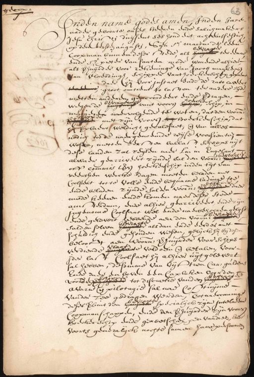 gecop 63 Onden name godes amen, Inden hare nader geboorte onsee heeren ende salich makers Jesu Chrisen duijsent ses hondert achtentsestich op den bersten augusti, Sijn Sr. martiu de leen bedranter ter eenng Coopman binnen deser stede als hui ende Sr. pieter van santen mede wonende alhier als verhuijrder voor rekeninge van Jacob mackersz van Claerdingh schipper hanthoeckerschep gesaeren daer hij voor instaet ende de rato taxeert tentene, groot omtrent 40 lasten ter andere zijde metten anderen geaccordeert ende verdragen, Boecken bevraosmd