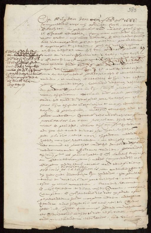 383 Op Huijden den x0i feb. Ao. 1666. Compareerde voor mij Adriaen Cock, nots: Publ. etc. in presentie vande nabess. getuijgen, Sr. Osaack verveelen, Coopman wonende binnen deser stede, mi nors. bekent „ ende verclaerde vercocht ende dienvolgende getransporteert, gecedeert „ ende opgedragen te hebbden gel. hij doet bij desen aen ende ten behoeve van Sr. Jan Aldertsz graeff, den ^ behalven den Inlech ƒ senvertie vantween tnegentich twee en dertichsepart aen t schiep, daer scht op gls. die hij Comptaende Pieter Dircxsz waterhout & bekenneende hij Comp. sebbe voorss. Schieseert gerem voorhandet vande preut hr. van Alders degraeff bourseert voor sijn neggen dt Cooppenn. van voorss. tween dertichste ptie het voorss. 1/13 part schlepes wegen nieuwe hart scheeps met de gereetschappen ende aencleeren Equipagie dien vandien al voldoen ende betaelt te sijn, den lesten desen niet en sijn penn: met de eerten, stellende derhalven deselve begreepen Jan Eldertsz de Graeff in sijn Compts. plaetse, inden vollen eijgendom, aituall ende reall porsessie vandt voorss. twee en dertighte part Scheeps, om het selve uijt eijgendr authoriteijt te mogen aenvaerden beseten, end gestuijcken, mitsges aercogen edes te gelde maecken ende voorts daer mede doen fanquam procurator in rem propriam sijnde vrijde wille ende geliefte, want hij Compt. verclaert - aen het voorss. twee en dertighte part scheeps gu. Actie, recht noch eijgendom meerder te hebben, nochte resrveren, in eeniger manieren, daer omme ten proffijte vande voorss. Jan Aldertsz graeff doende volcome affstant vandien, gelovende als principael ende Sr: Laurens wijngh hij Comtpt. en Beucktmrouhom (: meede Comparerende) als onder renuutiatie vande benefitien Borgen divisionis „ ordinis et excussionis, van welcke effecten zij haer wel onderrecht sijn houderde het gemelte - twee en dartichste part scheeps t' alle haarenen, Stroomen tijde op alle waateen ende Shevieren te zullen vrijdn ende waren, voor alle Calangien, ende opspraecke die daer op gedaen ofte gepretendeert soude moogen werden, onder het verbandt ende subjectie als nae rechte. Ende hebb ick Nots. vermaninge gedaen van deesen ter Sechetarije alhhijer te doen registreren, ingevolge vande wille keuren deser Steedel op't stuck van l