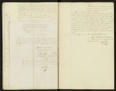 door de gemagtigde met den Notaris en de getuigen is geteekend