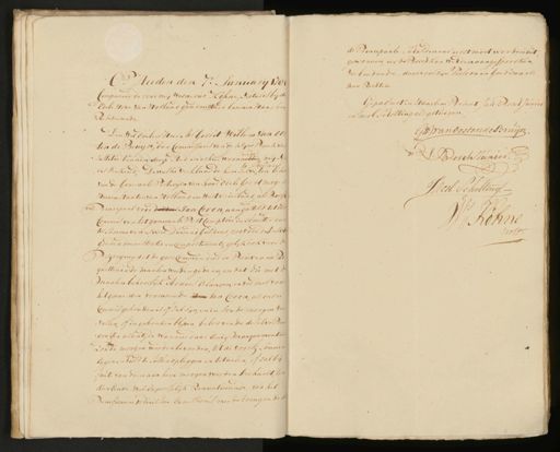 Op Heeden den 7e. Januarij 1784 Compareerde voor mij Vernerus Kohne, Notaris bij de Edele Hove van Holland geadmitteerd binnen Haarlem Resideerende Den Wel Edelen Heer Mr. Gerrit Willem van ob¬ ten de Bruijn, oud Commissaris van de Klyne Bank van Justitie binnen deeze Stad en alhier woonachtig, mij No„ Steller ris Bekend. Dewelke verklaarde hem zelve ^ ten beho van de Generaale Posterijen van haar Edele Groot mog: Heeren Staaten van Holland en Westvriesland als Borg en Principaal voor de Heer Jan Croon, aangesteld tot ons Commis van het generaale Post Comptoir in Amsterdam ter Somma van twee Duizend Guldens, zoo voor desselvs goede administratie en comportements, gelyk ook voor de Bezorging dat de gerecommandeerde Brieven en Pal quetten in de maalen werden gedaan, en dat die met de maalen behoorlijk Addres Erlangen, en verders voor het geene den voornoemde Heer Jan Croon, als onder Commis gehouden is of zal zyn, en in soude moogen ver vallen, of in gebreeken blyven, beloovende deselve Pen „gen, ten allen tijde wanneer daar Eenig manquement zoude moogen werden bevonden, tot de voorsz: Somme Eijgen schuld te sullen opleggen en betaalen, of zal bij faute van dien aan hem moogen werden verhaalt, ten dien Einde wel Expresselijk Renuntieerende van het Beneficium ordinissen Excussionis, meede brengende de de Principaale Schuldenaar eerst moet worden uit gewonnen eer de Borchkan werden aangesprooken, verbindende daar voor zijn Persoon en Goederen als naa Rechten. Gepasseert in Haarlem Present Jan Bosch Junior en Jacob Scholting als getuigen. G:W: van Oostende Bruijn N J: Bosch Junior Jacob Scholting. Ads. Köhne Nots.