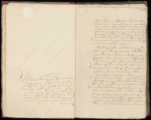 In den Naame des Heeren Amen kennelijk zy eenen iegelijk dien des behoord, dat op huiden den 2e. Januarij 1787, zijnde dingsdag des avonds omtrend vyf uuren, voor mij Johan nes Petrus Kuenen, openbaar Notaris, bij de Hove van Holland geadmitteerd, binnen de St Haarlem resideerende ende voor de nagenoemd getuigen in eigen persoonen gecompareerd ende verscheenen zyn den 2e: January 1787, zynde dingsdag des avonds omtrend vyf uuren 30 lb Jan Laa, en Kaatje van den BereEchtelieden, woonende op de kruisweg binnen deeze stad, gezond van lichaamen, en hun verstand, memorie en uitspraak wel hebbende en gebruikende als uitwendig bleek De welken verklaarden en overdenkinge van de zeker heid des doods ende van d' onzeekere tijd en uren van dien, geneegen te zyn van hunne goederen te disponeeren op de navolgende wijze. Eerstelijk hebben zy Testateuren, naar Christelyke recommandatie van ziel en lichaam, weder roepen ende te niet gedaan alle testamenten wille Codicillen en andere actens van laastg, by hen voor dato dezes alleen, ofte met iemand gepasseerd, niet willende dat dezelven, of een van dien eenige de minste kracht meer zal of zulhebben maar deze tegenwoordige Alleen. Ende zulks dan nugeheel en al wederom opnieuws disponeerende, zo verklaarden zij Testateuren, uyt echte Liefde en genegenheid, die zy den anderen ware tot dragende, malkanderen over en weder en zulks d' eerststervende den langstlevende van hen beiden, te nomineeren ende t' institueeren te tot zyne of haaren eenige en universeele erfgenaam en dat in alle de goederen, gelden, effecten, actien en Crediten, geene Uitgezonderd, die d' eerstster vende van hen beiden met de dood zal komen
