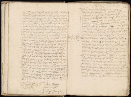 voor mr thomas Laurens prins Notaris mr. Frans Heynr. etc. priester et iur gerrijt heynr & Licentiaet burgermr der voors stadt haerlem als getuygen verleden metten voors. haeren za, man, zouden de selve maeckinge by desen in allen zynen poincten voor mil crachteloes ende „ onwaerden, In sulcken schyne off dezelve noyt en waer gemaect ende verleden geweest. Nyet tegenstaende dat de selve maeckinge schynen soude nyet wederroupelick te wesen als onder den levenden geschiet zyn. Soe in comparante expresselycken verclaerde, dat en expresselicken wil, de voors maeckinge ofte codicille zyet anders en zal werden verstaen dan een vuyterste wille, ende dat de zelve als by desen wettelicken gerenoceert ende te nyere gedaen zyn) In geenrehande manieren naer haere comparaties overlyden eenicheffect zal 4 moegen sorteren, ende sulcxs zy comparante egeene „ „ andere maeckingen dispositien, ofte giften hoe ende in wat manieren die geschiet moegen zyn van waerd van de en houdt dan, haeren testamente vuyterste wille ende laeste begeerte die zy by huyden date van desen voor my Notaris ende een geringen ondergess. gemaect verleden ende gepasseert het nopende de dispositie van allen haeren goederen. Ende oock over sulcxs wilt ende begeert. Dat dese haere renocae ende wederroupinge naer haere comparatien overlyden, soe vast ende van waerden zal gehouden werden, als eenich testame Codicille, ofte andere Dispositie, naer rechte ofte goeder gewoonten effect sorteren ende van waerden blyven mach. Ende tot dien eynde versochte aen my Notario van desen gemaect en haer gelevert te werden, een ofte meer openbare acten ofte Instrumenten Inder alder Aldus gedaen sterckster ende bester forme. verleden ende gepasseert binnen der stadt haerlem ten huyse van aelbrecht Symonsz Crapemerder staen inde grote houtstrate binnen derselver stadt, bijten dach Jaere maent ende Indictie alsboven. Alwaer, met my notario present ende tegenwoordich waeren als gelooff waerdige gem een voors aelbrecht symonss ende mr Willems thibruilt, poorteren der voors stadt haerlem tot kennisse van desen met my notaris versicht ende geveen M Eewoerden Willem Thijbaut B ende Een Albart Sijmonsz M Item by wesen van steffen claesz soutman ende Claes Janssen haere voochden ende bewintich haeren goeden verte stampt van Marryngen Hier¬ E XIIIIII O Inden Naeme ons Heeren amen. By desen es woordigen Instrumente zy eenen yegelicken kennelick ende openbaer hoedat inden Jaere vander geboirten Desselffs ons heeren duysent vyff hondert negen ende t zeuertich. De sevende Indictie des sondaechs den xxx dach van moierte omtrent vier vreij, nae noene Regneren Dalder doerluchtichste ende groot inwegenste prince voor my openbaer Notaris byden Hove van Hollat toegelaeten, ten by wesen vande getuijgen alhyer ondergescreven. In eygen persone gecompareert es geweest. De eerbare marn + gen gerrijts dochtere naegelaeten weduwe van wylen mr marten Jacobsz van eemskerck haeren eerderen en thomas van hueren haeren laesten man, inwoeren poortersse der stadt Haerlem mij Notario wel bekent) wesende in gaende staenden lyve met volcomen gebruyck van van uutman daer verstandt memorie en spraecke, soer haere spentelick bleeck. Ende heeft # met goede wint voordacht vryen moet en wille, sonder by yemal daertoe misleyt off gebrocht te wesen (soe perfectelick seydel begeert te disponeren van haeren tytelicken goeden, haer by god almachtich op deser werlt verleent, Insich nemen dat tsmenschen leven op deser aerden als een scadue vercanckel. Den doot zeecker ende de vuyre vandien geheel onseecker es. Bevelen altoes eerst ende alvoeren haere siele, soe wanneer die uuyten lichame scheyden zal, in handen van god onsen heere almachtich, ende haere lichame Der kerckelicke begravinge. Ende heeft mede voor all by desen wederroupen gecasseert geheel door ende tenyete gedaen, wederroupt casseert ende doet geheel doot, ende te nyetren by desen, in allen poincten ende clausulen, alle alsulcke testamenten van eerste willen codicillen oft andere maeckingen hoe ende in wat manieren, oock voor wien de zelve gepasseert ende verleden souden moegen wesen voor date van deser egeene vuytgesondert houden alle de zelve ende elcken vandien by desen voor geheel nul crachteloes ende van onwaerden allen schijne off de selve nyet en waeren gemaect Ende sulcxs van verleden ende gepasseert. nyeuws disponerende verclaerde te wesen haere Testamente vuyterste wille ende laeste begeert
