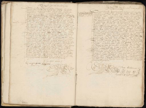 Een versoucke van elisabeth van van adrichem huyden Compareerden voor my Jansz van Boerden secrecaris der stadt haerlem Michiel ende notaris publyck by den hove van Hollandt toegelaeten Haeze Symons dr wedewylen Cornelis Hugeboem amsterdam oudt ouyr jaeren jegewoordelick, woeren vanden deser (worz stadt Haerlem Ende heeft by haeren vrouwen waerheyt in plaetze van eede geseyt getuycht ende verclaert. Dat omtr geleden twee jaeren sonder den juysten tyt onthouden te hebben Dat ende beegeert woenende binnen aerle zy getuyge # doertscrijven, van eene neeltgen aernis dr van amsterdam betaelt heeft aen machtelt van adrichem des voors elisabeths sustere, een pont vlaems ofte ses karolus guldens, op reeckenen van herten, die die voorn neeltgen aernis, aen voors machelt se van adrichen schuldich was. dat zy getuyge oock noch daer noch meer pennen hadde sonder get. zy juyst weer hoeveel van des voors neeltgen aernts wegen aen handen vande voors machtelt van adrichten betaelt heeft, so dan weet wel datter in als metter voorgaende pont groot omtrent thien oft elff gul mochte bedraegen haer refereren diesangaen tot haer bouck daer zy haer vaet voorstaen ter tselve geteijckent te hebben Te vreden, zyn zij getuyge alle tzelve met haeren eede te stercken des met recht versocht wesen versoucken van desen haer gelevert te werden een ofte meer behoorlicke sacken. Aldus gedaen. verleden ge ende gepasseert binnen haer hem den vierden april anno xvc lxxix ende pnten. ende baerntss backer ende Jehan Joosten ende goutsanth poorieren der voors stadt haerlem als getuygen niet my michiel van woerden versocht ende gebeden by my Pieter Barentsz by myn Jan Oosten gewoerden Clag M - geassisteert met tenen hebben desen haeren gecoert voocht Procuratie van Joncke Margriete van der mer weder Compareerden Joncvrouwe margriete van der geassisteert tenen maerwe naegelaeten weere wylen Derick van ebst muysenburch als moeder ende intervenieren voor sesen haeren gecoert anvergen van mysenburch haere dochtere voocht abstent zyn. Constitueerde willen Joosten poorter ende inwoonder der stadt Dordrecht inde blaeuwe hant aldaer woenen. Omme te defenderen beschudden ende beschermen, allen den goederen ende innecomen vande voors. annetgen vry muysenburch haere dochtere Op ende jegens een yegelicken eenen ygelicken, Die eenich actie oft recht daer op souden willen pretenderen Ende dit alles volgen den Last ende Instructie die den zelven geconstitueerde, op elcke pretens¬ actie ende becomende swaricheyt by haer constituate daer toe overgeschick ende gelevert zal werden, ende voorts ad lites in abq communiter quoscuncque, cum potestate subdi in communem forma Met belofte van ratificae van alle tgundt den voors willen Joosten, zynen gesubstitueerde ende telcxs van hen bysonder in haere voors zaecken van t crachte ende conform den last ende instructie hen op elcke pretense actie ende opcomen swaricheyt zal gedaen ende gebesommeert werden, Onder een verbonden als naer rechte Aldus gedaen verleden ende gepasseert, binnen haerlem een tweeden aprilis anno xviC. negen ende tzenedich ten huyse van Sybrat van berckenroede Inde he Rans strate alwaer present ende jegewoorden waeren, den voorn. In brede van berckenroede ende mr. herebert stalpt vander wiele als getuygen tot kennisse van desen met my Notario specialen versocht ende gebeden van Berkenroe Crommelin M. Swoert 4 Mevr Herebert stalpt van wyck