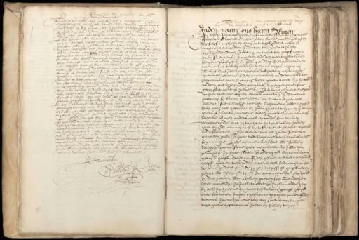 Protestatie ten versoucke van pr van s’compyck Een versoucke van pieter van sompyck, Soe hebbe Ick Michiel Janssen van woorden openbaer notaris by den hove van Hollandt geadmitteert by wesen vande geringe ondergenaemt myn „ hebbende aen persoon van cornelis engelssen bierma tot velsten Ende hebbe aenden zelven versocht betalinge van deerste termyn belopen twee hondert guldens, dien hy stompyck gereet bedongen hadde nu te lichtmisse xvc negen ende tachuch lestleden over den coop van zeecker lant tot velste byden voorn cornelis engelssen gecoft, ende soo noch twee gelijcke termijnen „ onbetaelt was hy stompyck te vreden den voorn cornelis engelssen waerborge te stellen voor t vercoppe lant, by aldien verstaen mochte worden met rechte dat hy daer toe was gehouden ende vorder nyet. Presenterende in ettemin tot borge voor desen eersen vernesen te stellen claes Janssz oudt burgermr der stadt haerlem die present zyn oock daer toe te vreden was Ende by wen geringe vande voors versochte becoeninge vanden eersten termyn die te lichtmisse gereet bedongen was Soe heeft den voorn. pieter van stompyck geprotesteert ende protesteerden by desen tegens den voorn cornelis engelssen van allen costen schaden ende interesten aen de voors. hy soe Int vergeeffs reysen van amsterda tot haerlem, alrede daeromme gedaen gehadt ende beleden heeft, ende noch doen hebben ende by den 3 al mogen by t’ont beren van zyne voors gerede bedongen termyn van lichtnus lestleden aff totter en welc betalinge toe, Omme dezelve aenden voorn voorn engels ende zyne goederen te verharen soo hy te ronde vinden hal. Daer op den voorn cornelis engelssen wy notaris ter antwoorde jaff dat tgeene den voorn Stompyck versochte, dat hy tselve mochte men rechte versoucken van alle t welcke den voorn. stompyck dese acte aen my notario versochte die gedaen ende gepasseert es den XXen februario xvc negen ende nachtich indecruyssraet voorthuys van den Jan Lucasz cleermal francois coman daer present waren den voorn claes Jansz oudt burgermr. der stadt haerlem ende gerryt Janssz Roos bien rinde tot velsen als getuygen van gelove hyertoe met my notario special. versocht ende gebeden Isaattestor W:V: no. 7 stver. M Bewoerden XIII van werte rezers dr. wedewe Testament van wylen dirck maer is ende inden clock Inden naeme ons heeren Rimen By desen Jegenwoordigen Instrumente zy eenen ijegelicke kennelick ende openbaer, dat inden Jaere naeder geboirten desselffs onsheeren duysent vyffhondert negen ende tachtich ter tweeder Indiction des Sondaechs den vyfthienden dach Januarij, omtrent ten halff negen uren smergens, Impererende den onverwinelicksten keyser Rodolphus, by goods genaden, De tweede van dier naeme Int veerthiende Jaere zijns rijcxs, voor mij Michiel Jans soon van woerden tot haerlem residerende openbaer Notaris, byden pronincialen raide van hollt tot dexercitie vant Notarisschap geadmitteert, In by wesen is vanden getuijgen ondergenoemt, In eygener persone geconstitueert es geweest, Eerbare Guerte reijers, dochter weduwe wijlen Dirick maertsz Inden clock poortersse binnen haerlem (my Notario zeer wel bekent) sieckelicken naerden lichame te bedde leggende dan noch wel hebbende by goods natie volcomen gebruyck haers verstants, memorie ende spracke soe claerlicken bleecke ende men anders nyet en conde bemercken, Verclaerende dat zy van haeren tytelicken goeden. haer by god almachtich op deser werlt verleent, begeerde te disponeren, Beuelende voor all haere siele der genaden goods, ende haer doode lichame der kerckelicke begravinge, Ende aenmercken dat mr Willem diricxz haere soone haer merckelicke somme van penningen In zyne studie ende onderhout buytens lants gecost heeft, daer toe sij den zeluen meckelicke sommen heeft moeten toeseynden, twelck wel bedraecht ouer de seven hondert gul., die zij hem toegeschit heeft alleen zedert mr Reynier zynen ja ooms overlyden, Soe heeft zy den zeluen mr Willem haeren soon omme redenen haer moveren, geinstitueert ende Institueerde hem by dess In tgeene hy haer testatrice gecost heeft ende bouendien In een lyffrente van thien ponden groon vlaems Jaerlicxs, die hem vry sonder cortinge vuyt haere testatrices goederen zullen volgen.