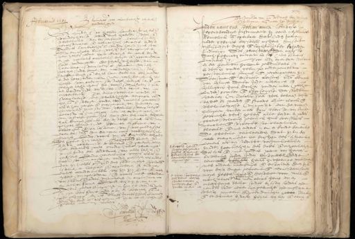 Procuratie van Lambrecht reyersz Gebruarmen 1589 van der voors. huyden Soo heeft Lambrecht reyers ende Pr. wonderhorst, wonende binnen haerlem wel ende wettelicken Inder bester forme doenlick zynde reconstitueert ende volmachich gemaect by desen Andries Lambrechtsz vander Horst zynen soon specirdicken ome volgen de vercopinge by hem zelffs gedaen opse draegen tot eenen vrye en gen cornelis pouwelsz burger ende poorter der stede vander goude, De gerechte helfte van zeeckere steenplaets e genaemt desuel gelegen inden banne van moordrecht, ende in yssel metter binnen ende biesen lant daer aen behorende by den hoop sonder maer, met noch de gerechte helfte van omtrent sestalff mergen lants gelegen recht tegens de voorss. steenplaetse over aen Donder zyde van Eyssel Inden banne van onwerkerck. Van alle welcke landen ende steenplaetse, de wederhelfte teecompt cor„ heynr & swager, vanden voorn cornelis pouwelsz als by hem gecoft ende overgenomen van dienwer henricxdr zyne sustere welcke steenplaerse belast es int geheel, met een en vige pachte van vyftoeff groot, is, daer van den coper de helft zal dragen Ende desestalff mergen lats Int geheel belast zynde, voet een lyffrente van twee gul ende een losrente van twee gulden sjrs daer opstaen die den coper oock voorde helft zal draegen. Ende voors vry als bierlant behouden alto „ den heere zyn recht, Behoorled brieven te verlyden waernisse te beloven ende generalen alle hem gepaerdts goeden voorde zelve waernisse te verbinden tot bedwanck van allen rechten ende rechteren. Ende generalicken voorts alles te doen soe Int ontfangen vanden penningen als anders dat hy zelffs put zyn doen soude inghen, Relovende tselve te ratifieren ende approberen ende enwigen daegen Onder t verbaal van zyn zyn versoon ende goeden egeene vuytgesondert, ende voorts mette belendens van t laet ende anders vuytgegeven In amplissima en melivri forma Ende versochte hyer van acte Aldus gedaen ende gepasst, ten huyse van compt In St Roms strate den xvii en february @no xxixe. Jnten Claes Jacobsz ketel cleermaker xvc lxvC als getuygen hyer toe versocht ende ende mr. van bont gebeden met my notaris ƒ D Edle. No. 1 De werden M 89 # Bevelen heurl. sielen een genaden dodelichamen der voors. ende heure kerckelicke begrauwe # voor sulcx hem deselve deses souden mogen contrarieren ende vorder nyet xxvj Testament van mr. Adriaen van teylingen ende Hilligont vande meer zyn huysvrouwe onder name ons heeren amen, By desen — ƒ egenwoordigen Instrumente zy eenen ijegelicken kennelick en openbaer Dat Inden Jaere nader geboirten desselffs ons heren duysent vyffhondert negen ende tachtich ter tweeder Indiction Des woensdaechs den achtsten dach february omtrent ten ses uren tsamonts Impereren etc. Voor My openbaer Notario by den hove van hollant geadmitteert In by wesen vanden getuygen ondergenoemt persoonlicken gecomen ende gecompareert zyn D'eersame ende discrete persoren, Mr adriaen van tenlingen Doctor Inde medecynen ende Hiligom Jans Dochter vander meer geechte Luyden) poorter ende poortersse der stadt ende den getuygen Haerlem, (my Notario,, zeer wel bekent) wesen beyde in gaenden ende staenden lijve clorck ende wel te passe (vuyt geseyt) dat de voors hilligont vander meer opte uterste van kinde bevrucht was) hebben alle beyde by wes gratie volcomen gebruijck huus verstants memorie, ende spraecke, soe claerlicken bleecke ende men anders niet en konde bemercken De welcke verclaerden dat zy lien den naer overpeynsende de brosheyt des tytelicken Levens als een scaduwe verganckelicken henrl. zynde zeeckerheyt des doots, ende onzeeckeryt ende genade zamen der Des tyts ende Iure vandien, jaerne van heuren heure tytelicken goeden souden disponeren # Ende cke en renoceeren voor all heurl. huwelicxe voor waeren ge¬ testamenten met anderen „ maeckingen ende dispositien dien zyl voor desen daege gemaect ende gepasseert souden soovele mogen hebben houdende, deselve voor null ende hebben voors. De deser crachteloes # Nu met elcxs heuren vrij en nog en onbedwongen wille, sonder by tsteen sanders ofte neren ende ien et yemats ronde daer toe gebrocht ofte misleyn v wesen, gemaect ende geordonneert hebben, Maken ende ordonneren by desen heure beyder & elcxs