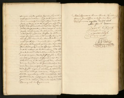 te moeten werden, gekort, daar van suijver te ontfangen sal weesen: Ende verders generalyk omme in vervolgh van tijd aldaar mede te Innen, vorderen ende te ontfangen, alle sodani¬ penn: Ende gelden, als van tyd tot tijd bevonden souden mogen werden, aldaar weegens verdien gagien, tractementen, Emolumenten, als alle andere penn: uijt wat hooffden die souden mogen spruijten, van ende voor Reekening van haar Comptes: voorn: soon Marcus de Haan, te ontfangen te sijn: van alle sijne respe: Ont¬ fangsten behoorlijke quitantien te passeer¬ (des noods) de gerequireerde Borgen te stellen ende die wederom te Indemneeren, Ende verder In ende omtrend alle 't selve meerder te doen ende te verrigten, dat de Juff: Compte: in hare vermelde qualiteyt, selffs present sijnde, soude kunnen ende vermogen te doen, alwaret dat nog Ampelder ende speciaelder Last den deesen daartoe mogte werden gerequireert die de Compte: nogtans verklaarde te houden voor alhier mede ge-insereert: beloovende te sullen approbeeren alles wat door den voorn. Gesubstitueerde uyt Cragten deeses sal werden gedaan ende verrigt, alles onder verband Ende bedwang als na Regten Aldus Gepasseert binnen Haarlem Voornt: Present Jacob Cloet ende Jan van Rijse als agneta van der wal Getuygen wedu Jan d'haan Jacob Cloet E Jan van Rijse M J:J: Galle de Nots: 17 13/3. 35. Publ.