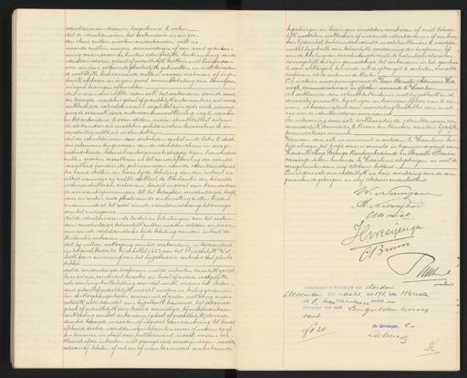 schuldenaren daarin toegestemd te weten: dat de schuldenaren het verbondene in een goe den staat zullen moeten onderhouden, niet in waarde zullen mogen verminderen of van aard of bestim„ ming veranderen en buiten schriftelijke toestemming van de schuldeischeres, geheel of gedeeltelijk telkens niet langer dan voor een jaar volgens de plaatselijke gebruiken en niet beneden de werkelijke huurwaarde zullen mogen verhuren of in ge bruik afstaan en ingeen geval voormitbetaling van huurpen ningen bedingen of genieten. dat indien om welke reden ook, het verbondene door de daar toe bevoegde machten geheel of gedeeltelijk onbevoonbaar zal worden verklaard de schuldenarell verplicht zijn op de eerste aanzeg ging de oorzaak dezer onbewoonbaarverklaring weg te nemen en het verbondene te doen stellen indien staat dat het volgens de als dan door die machten gestelde eischen bewoonbaar is, on= verschillig welke die eischen ook zijn dat de schuldenaren den verbonden opstal en de later te stich ten gebouwen ten genoegen van de schuldeischeres in eene ge accrediteerde brandwaarborgmaatschappij tegen brandschaa zullen moeten verzekeren en tot aan de aflossing der schuld verzekerd houden, de polis daarvan aan de schuldeischeres ter hand stellen en haar bij de betaling van den intrest en altijd wanneer zij zulks verkiest, de Kuitantie der betaalde assurantie Kosten vertoonen, terwijl ingeval van brandschade de assurantiepenningen tot het beloop der verschuldigde hoofd som en renten in de plaats van de onderzetting zullen treden onverminderd het recht van de schuldeischeres op het overige van het onderpand. dat de schuldenaren de lasten en belastingen van het verbon- dene verschuldigd, behoorlijk zullen moeten voldoen en daar van aan de schuldeischeres bij de betaling van den intrest de kwitantie vertoonen dat bij willige verkooping van het verbondene, uitgezonderd in het geval bedoeld bij artikel 1223 van het Burgerlijk met boek geene zuivering van het hijpothecair verband zal plaats hebben dat de verschuldigde hoofdsom met de intresten dadelijk opeisch baar zal zijn, zonder dat daartoe een bevel af andere soortgelijke acte van ingebrekestelling vereischt wordt, indien het verbou= dene geheel of gedeeltelyk mocht worden en beslag genomen ten verkoop aangeslagen, vervreemd of verder met eenig ander zakelijk recht dan dat van hijpotheek bezwaard, het gebouwde geheel of gedeeltelijk door brand vernietigd, bij onbevoonbaar verklaring van het verbondene (geheel of gedeeltelijk) door de daartoe bevoegde machten of ingeval van aanvraag tot boedel afstand door de schuldenaren of een hunner of indien zy of een hunner in staat van faillissement mocht worden ver„ klaard ofde intresten niet prompt op de verschijndagen mochten voldoen of betalen of wel een of meer der andere vorenstaande bepalingen en bedingen mochten overtreden of niet behoor= lijk mochten nakomen of indien de schuldenaren of een huis ner tijdens het bestaan der schuld mochten komen te overlijden en dat bij gebreke van behoorlijke voldoening der hoofdsom of van de betaling der verschuldigde rente de schulderscheres on herroepelijk zal zijn gemachtigd, het verbonden in het openbaar te doen verkoopen, ten einde uit de opbrengst te verhalen, zoovelde hoofdsom als de renten en de Kosten. En is alhier mede gecompareerd de Heer Cornelis Adriaan Ho= nigh, commissionnair in effecten wonende te Haarlem die verklaarde deze schuldbekentenis met hijpotheek en al de daarbij gemaakte bepalingen en bedingen bij deze aan te ne„ men, in hoedanigheid van mondeling lasthebber van en al- zoo voor de schuldeischeres voornoemd Ter uitvoering dezer acte verklaarden de schuldenaren on veranderlijk domicilie te kiezen ten kantore van den tijdelijke bewaarder dezer minute Waarvan deze acte in minuut is verleden te Haarlem ten bijde als aan het hoofd dezer is vermeld in tegenwoordigheid van Hendrik Meye Reyenga Kantoorbediende en Cornelis Brunn concierge teiden wonende te Haarlem als getuigen en met de comparanten aan mij Notaris bekend. En is deze acte onmiddellijk na hare voorlezing door de com paranten de getuigen en mij Notaris onderteekend. W. Nieuwjaar M Nieuwjaar Cussinigh Meyenga Bruin Witsen. mrtuur Geregistreerd te HAARLEM den derden December 1900 en acht, deel 171, folio 114 recto. vak 8, twee bladentwee renvooi en Ontvangen voor recht Een gulden twintig cent. De Ontvanger, b.a. ƒ1.20 Aekreur De