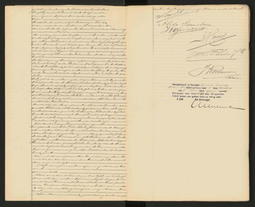 ranten, de getuigen, en mij Notaris onderteekend. W Bout Alida Sonneborn Haj van arkom verte Camer H. P. Thunis J Koolman Notaris. Geregistreerd te Haarlem twee en twintig December 1900 vijftien deel 5 folio 130 recto vak 8 een blad geen renvool Ontvangen voor recht f 1,20 voor 10 opcenten f 0,12 samen een gulden twee en dertig cent, f 1,32 De Ontvanger Meulincx gesteld in handen van de Middenslandseredusbank terwijl bij eventueele brandselrade de assurantie. penningen in de plaats dezer onderzetting zullen treden dat alle lands in plaatselijke belastingen behoorlyk zullen moeten worden voldaan en de kindantien dan van evenals die der assurantie, terstond na elke voldoening moeten vertoond worden. dat zoolang voormelde hoofdsom met de renten in kosten reeds verschuldigd of nog versehuldigd wordende, niet geheel zal zijn afbetaald, het verbondene niet met later hypotheek zal mogen worden bezwaard, noch hetzelve voor langer dan twee achtereen volgende jaren tegelijk of voor beneden de werkelyke huurwaarde worden verhuurd, geene hunspenningen vooruit mogen worden ontvangen of daarover ten behoeve van derden mag worden beschikt das bij onteigening de onteigeningspenningen in de plaats- der onderzetting zullen treden ende comparanten de Midden stands Credietbank onherroepelijk machtigen de onteigeninge penningen te ontvangen en doorvoor kwijting te geven, ten einde daaruit het verschuldigde met renten en kosten te ver- halen. dat bij gebreke van voldoening van het geen later mocht blyken door de comparanten aan de Middenstandscrediebank verschuldigd te zijn deze onherroepelyk zal zijn gemachtigd om het verbondene in het openbaar, volgens plaatselijk gebruik te doen verkoopen de voorwoorden te regelen, de kooppenningen te ontvangen en door voor te kwileeren, het verkochte te leveren, ten einde uit de opbrenge, voorzoover het bedrag zal kunnen strekken, al het haar komende met de koolen te verhalen. voorts verklaarden de comparanten als aandeelhouders van gemelde Middenstands Credulbank volkomen bekend te zijn met de statuten van gemelde Middenstands Credielbank in het bezonder artikel zes en zich doorna te zullen gedragen. zullende de bedingen ten aanzien der onherroepelijke vol- macht en niet zuivering eerst dan van kracht zijn, wanneer dit verband, eerst ingeschreven zal zijn geworden: En compareerde mede de Heer Willem Albertus Johannes van de Kamp, administrateur, lid van den Gemeenteraad van Haarlem, wonende aldoor, als volgens zijne verklaring mondeling gemachtigd door den Heer Benjamin Teensma, wonende te Haarlem, in diens hoeda nistreid van eenig directeur van de Middenstands Credielbank voor Haarlem en Omstreken gevestigd te Haarlem, die verklaarde de voor„ melde hypotheekstelling onder de bovenvermelde bepalingen namens gemelde Middenstands Crediet. bank aan te nemen Kiezende de comparanten ter uitvoering dezer do„ nicilie ten kantore van den bewaarder der minute dezer uwen mettertyd De comparanten zijn mij Notaris be. kend. Waarvan akte. Aldus verleden te Haarlem ten tijde in het hoofd dezer akte vermeld, in tegenwoordigheid van de hee„ ren Antonie Hamann en Hendricus Sebastianus Thuis Jacobs zoon, beiden Notarisklerk en beiden wonende te Haarlem, als getuigen, mij Notaris be- kend. Deze akte is onmiddellijk na voorlezing door de compa